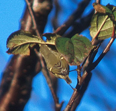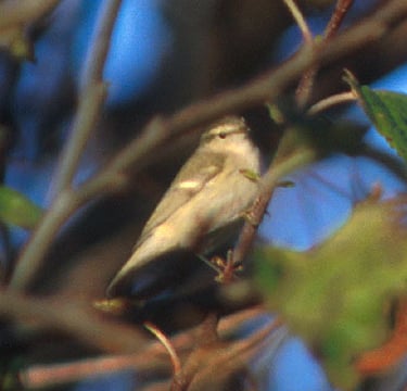 Late afternoon light made the pictures slightly warm. But note the greater coverts; the ground color is slate grey, giving the wing less contrasting appearance than in the similar Yellow-browed Warblers Phylloscopus inornatus. Do also note the greyish head, contrasting to the somewhat greener back. The bird was aggressive and territorial. It chased away a.o. Chiffchaffs approaching its feeding tree. The sound of this individual was actually quite Chiffchaff-like, somewhat more high-pitched.
