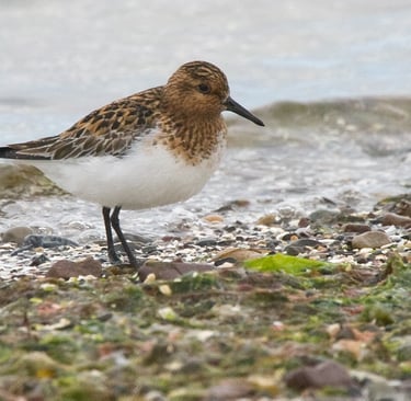 Summer plumaged shorebirds are often brighter colored than during winter. Like this stunning adult male Bar-tailed Godwit feeding in the shore amorg the Phalaropes.
